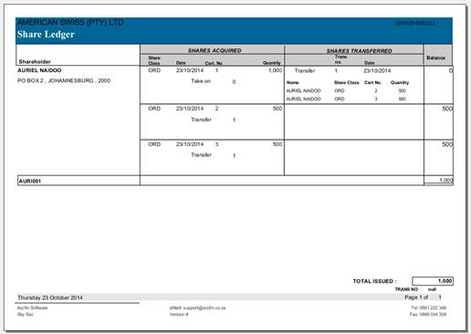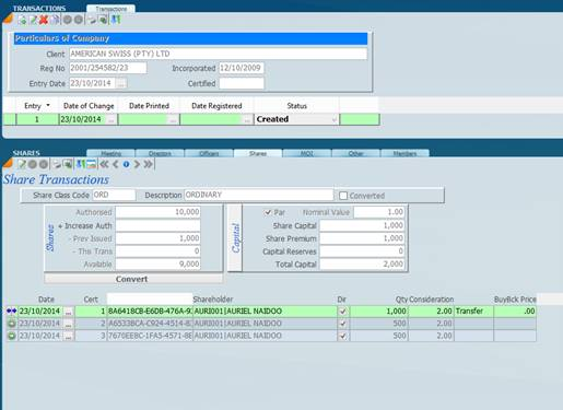 The way the new share grid has been designed one can easily manipulate the shares in order to prepare for a future transaction. The screen below illustrates this, it is the end result of one share certificate, share certificate number 1 being split into share certificate number 2 and 3. This is just a question on clicking on the open space to the left of the line item shares certificates.