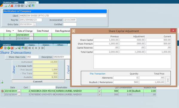 The screen below shows the two share certificates 2 and 3 and you will see the left of the share certificate number 2 there is a little red icon, this means that it has been bought back. We would normally click on this area and then we would indicate the buy-back price. After we have done this we have clicked on the capital button which will be to the left of the brown share capital adjustment screen and you will see that we bought back 500 share certificates at R2 per share giving the total price of R1,000. The share capital, the share capital above reflects an adjustment, a payback of R500 to share capital and R500 to share premium, leaving the balance of R500 each with a total of R1,000.