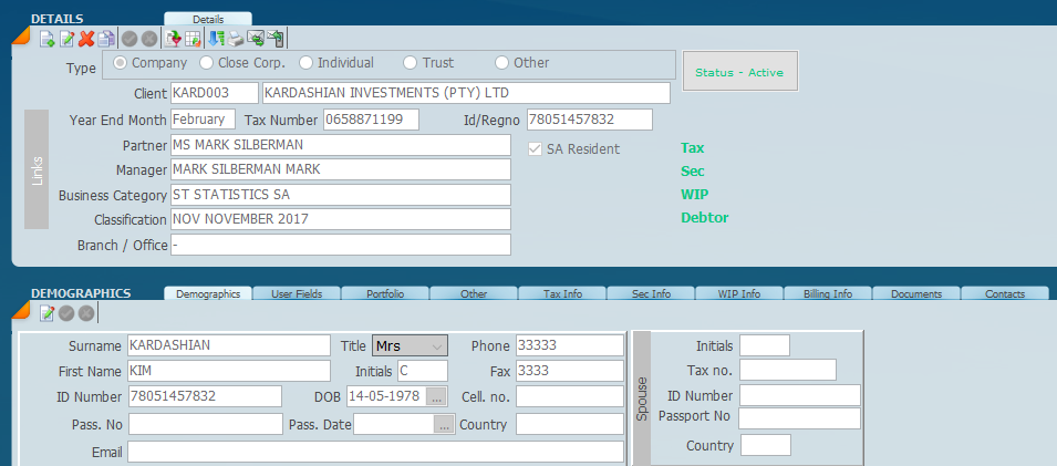 For the purpose of this manual we are not going to detail each field that needs to be entered, however you should go through each screen on your system to see what is required. In terms of running the tax system it is most important that you deal with the demographics in total and the tax details. All the information contained in the Client file will be used in all the applications.