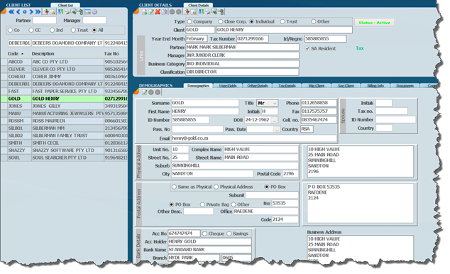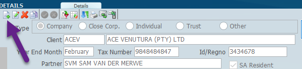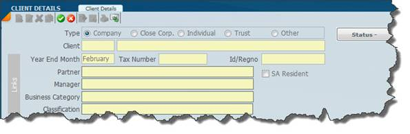 The screen depicted below is the most important information that needs to be taken on for the client in question. You will see that there are a lot of small icons on the top above each panel and we will explain them shortly. You will also see that there is a set of radio buttons after Type (header panel) and to the right of this you need to indicate what kind of client it is. If it is a company, a close corporation,individual, trust or other if it does not fit into these categories. For example this could be a school or a non-client shareholder then you would need to tick other.