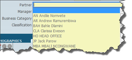 Once you click on these items the other file will open as below and show the choices you have, and then it is just a question of scrolling down to the name you want and clicking on it and this will display in the record that you are creating. If you click on the Partner area the following screen will display indicating all the partners to select from.