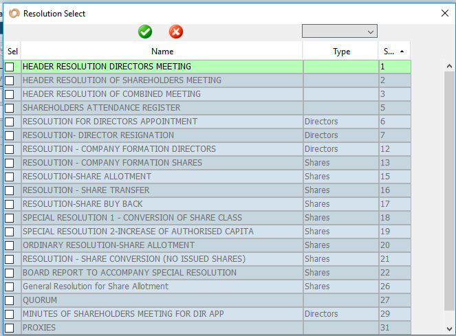 5. On the popup screen, select the resolutions applicable to the type of changes done on that entry by clicking the small white box