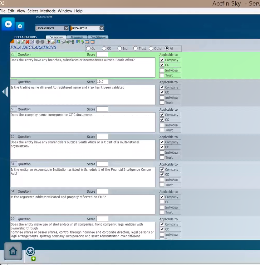 This is where you set up all the different declarations for the different type of clients, being company, CC Individual and trust. The declarations should be based on the Risk mangement Compliance program (RMCP) your firm has created and should be scored in order to determine the risk factor.