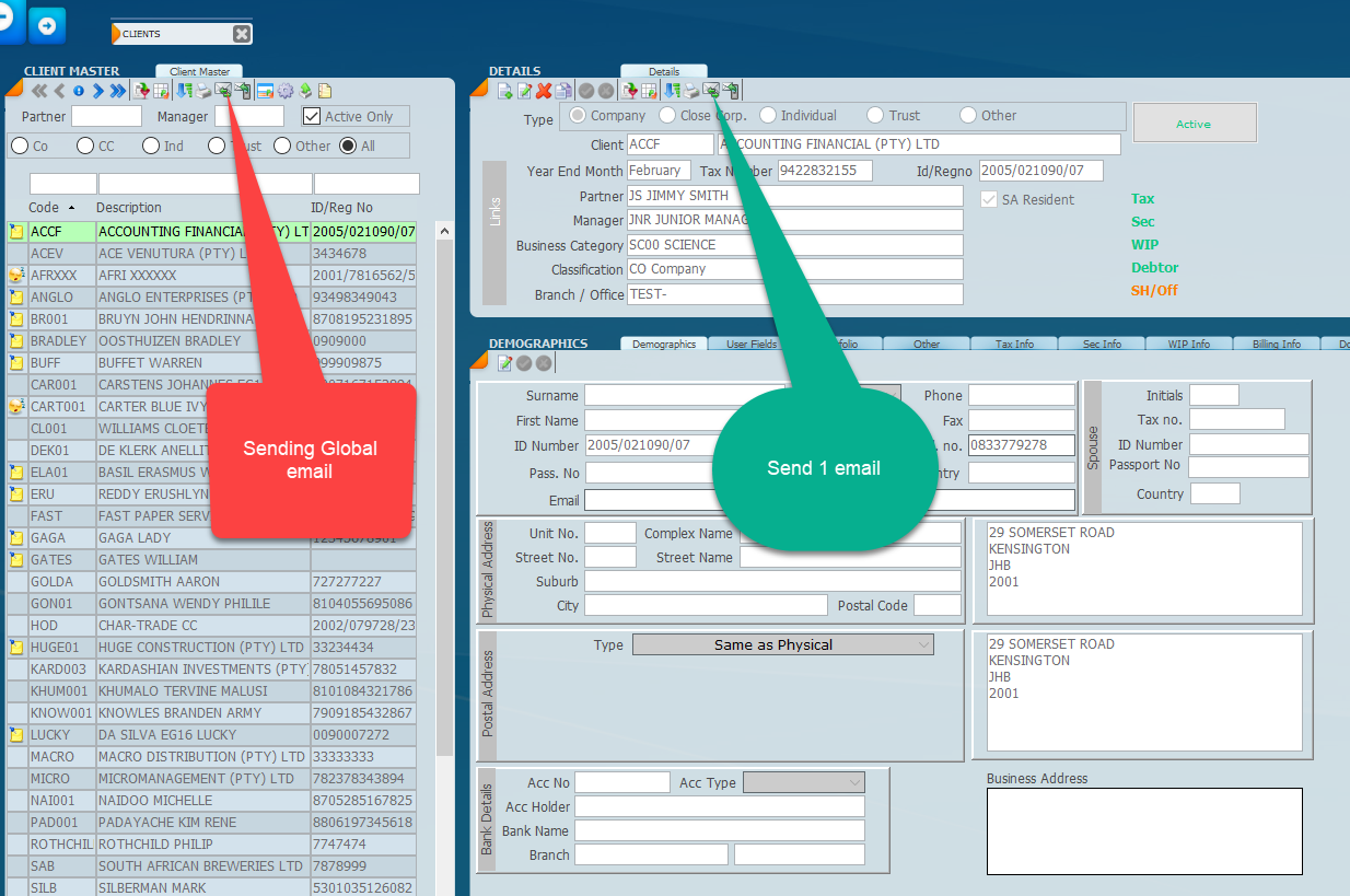 2. There are two ways that we can send the e-mail to the clients. We can either click on the e-mail icon on the top left-hand side which will generate the e-mails in bulk for all the clients that are listed, or we can do it one at a time by selecting the client in the list panel on the left and then clicking on the e-mail icon on the top right-hand side. Refer to the arrows above. When starting off test one at a time.