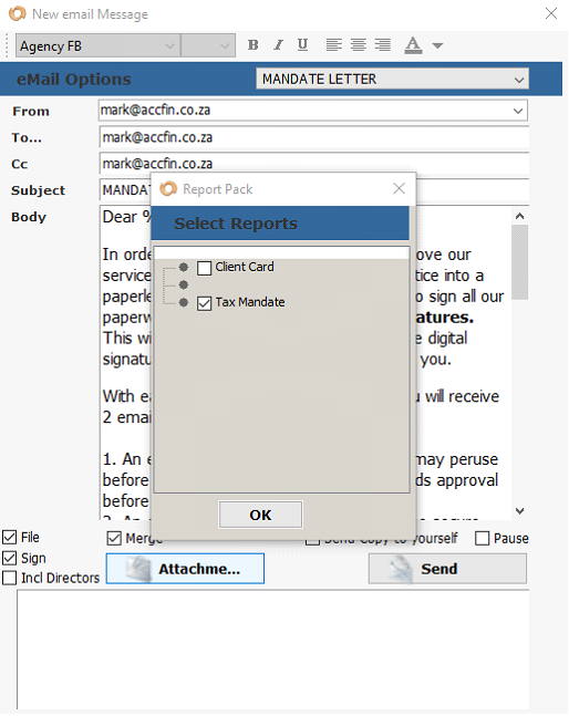 5. Click on attachments and select the letter you want to send to the client, in this case a tax mandate letter.