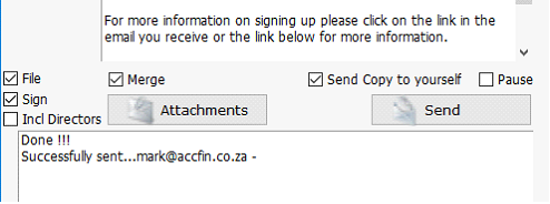 7. Once you click on the send button you will notice a message at the bottom of the screen which says processing. On the successfully processing of the e-mail with the attachments the message in the box at the bottom will display indicating that the emails have been sent successfully. If you are sending out the e-mails in bulk, then as each e-mail is sent it will display in the box at the bottom