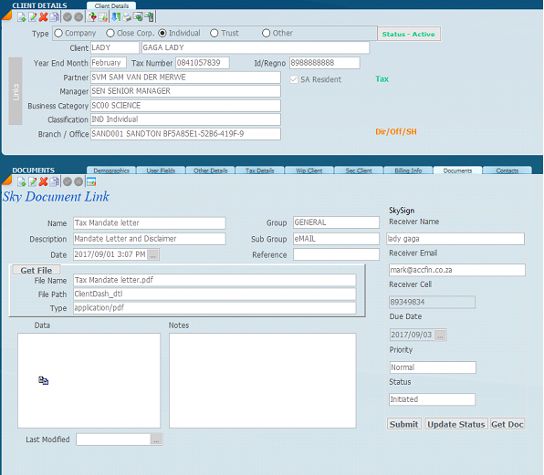 9. You will notice the various defaults on the right-hand side above. The system indicates the e-mail address that the attached documents went to, as well as other bits of information. At the bottom, you have got priority which says normal at this stage, and the status says Initiated. This means that the Digital Signature has been activated. There is a data box with a small icon of two miniature pages. If you click on this icon the PDF form that you have sent to your client will open. At this point it will not be signed because the process has just been initiated and not completed by the client. When the update status button is clicked the status word will change to in progress and will eventually change to completed when the client signs the document. When you click on the Get Doc button the signed form will replace the original blank form in the database. If you click on the data box the PDF Form will be loaded with all the pages and the signature in place.