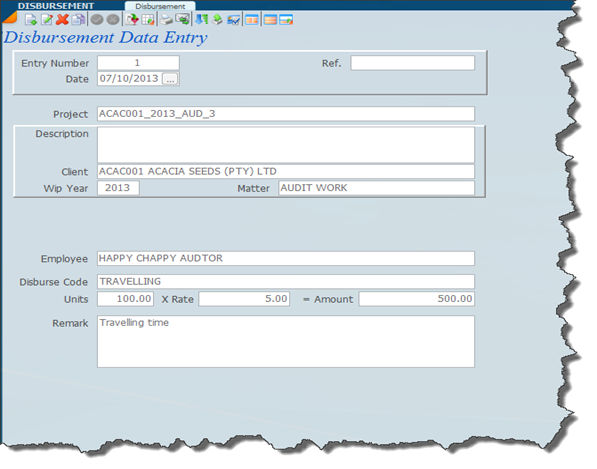 The screen shown below is a disbursement entry screen and disbursements are allocated to a particular project. You need to put in an employee code and a disbursement code, for example when it is traveling you enter in units and the rate and there is space for you to type a detailed remark.