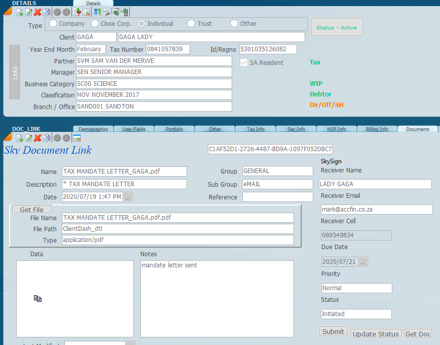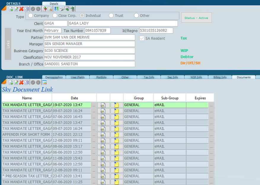 On the screen below on the master client file the Documents Tab will allow the storage of an unlimited number of documents. Documents from within each module can be stored but can all be seen from the master file. The group and subgroups can be used to sort the documents for easier access. Eg. Tax, Sec, Drs