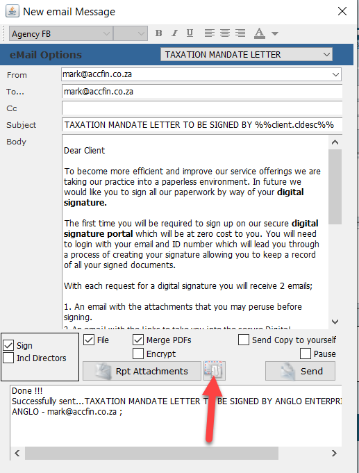 By clicking on the document icon as indicated above the user may navigate to any document on the system in use and attach it to the email going out.