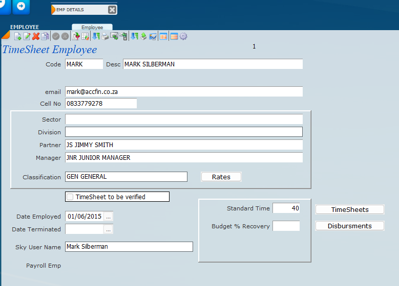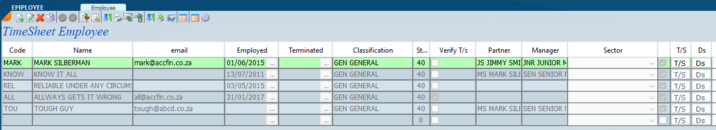 The screen detailed below is a list view of employee maintenance and you can see that a particular employee is allocated to a partner or manager as well as a classification.