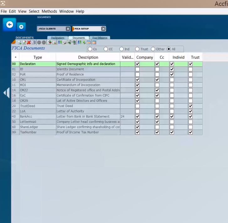This screen gives the default list of documents required for each type of entity in accordance with the Risk Management Complinance Program (RMCP) where you can indicate each type of document required for each type of client in terms of the RMCP. Notice how the different documents are ticked below. This will cause the document ticked as an individual to be processed against an individual. Where the entity is processed the place holder of the documents selected for that entity will display and allow the uploading of the particlar document.