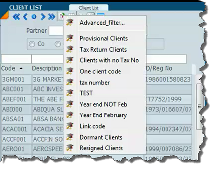 The menu items below advanced filters are the ones that have been set up as usable definable. Sky comes with many of the filters setup. Once you select a filter the left hand panel of clients will display the filter set and once you select the clear (2nd icon above) this will have the effect of removing the filter set and displaying the full list of clients.