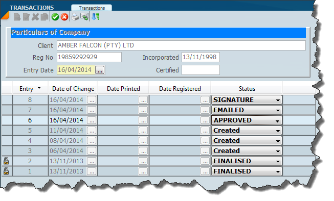 In SKY we have adopted a different approach in that all the secretarial transactions performed are in fact in real time. And it is then necessary for you to set the status on the transaction to reflect exactly where it is in the process, for example you can have a whole lot of status words like "gone for signature", "signed", "registered", "CIPC", and then the last one would be "finalised", and those transactions that are marked finalised cannot be edited and they in fact become final. Once a transaction is finalised the system reflects a lock icon against the transaction and the transaction cant be edited unless its unlocked.