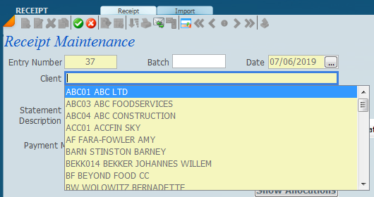 Insert the amount. Click on the “show allocations” button to allocate to a specific invoice. if you don’t do this, the receipt will be allocated to the oldest invoice.