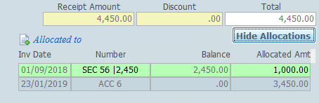 Insert the amount. Then click on the “Allocated to” button to allocate to a specific invoice