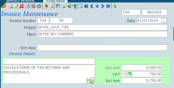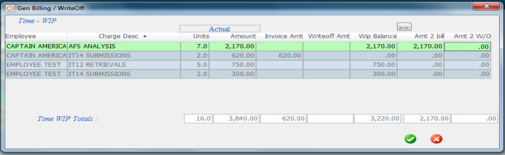 Insert the amount you want to bill per employee on the “Amt 2 bill” column. You can also write off amounts on the “Amt 2 W/O” column. Then click on the “green tick” to save then close this screen. The amount you have entered will now pull through on the invoice details