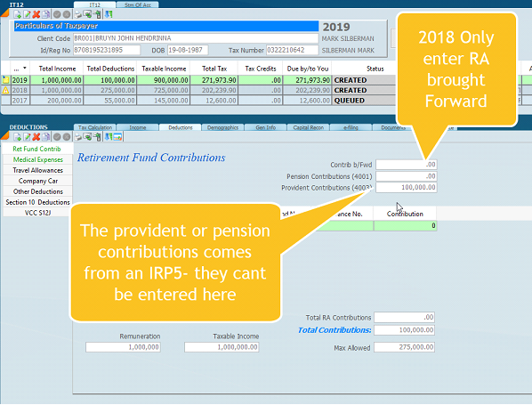 When doing the 2018 tax return, do not take into account the pension or provident account brought forward as SARS will deduct them as the law was changed and the system of calculation changed. SARS will automatically deduct the pension and provident contributions brought forward in 2018. After 2018 the calculation will work for all three as the retirement annuity, the pension contributions and the provident contributions will be treated as one total.