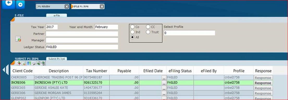 On the EFILE P1 IRP6 screen as below, you can select FAILED for ledger status and it will show only those taxpayers who have a FAILED status.