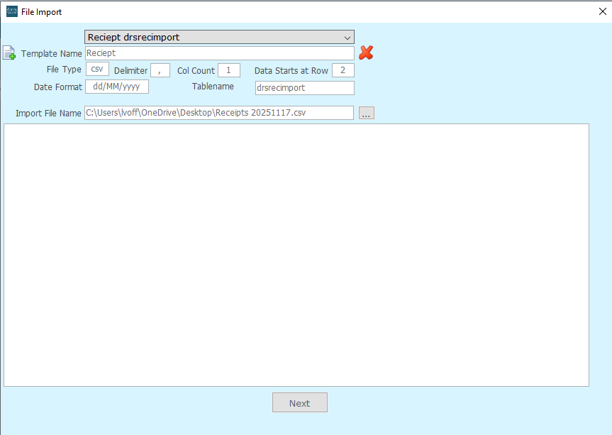 Click on Next on the File Import Window and wait for the file to import and the screen to change. Patience may be needed, depending on how big the file is.