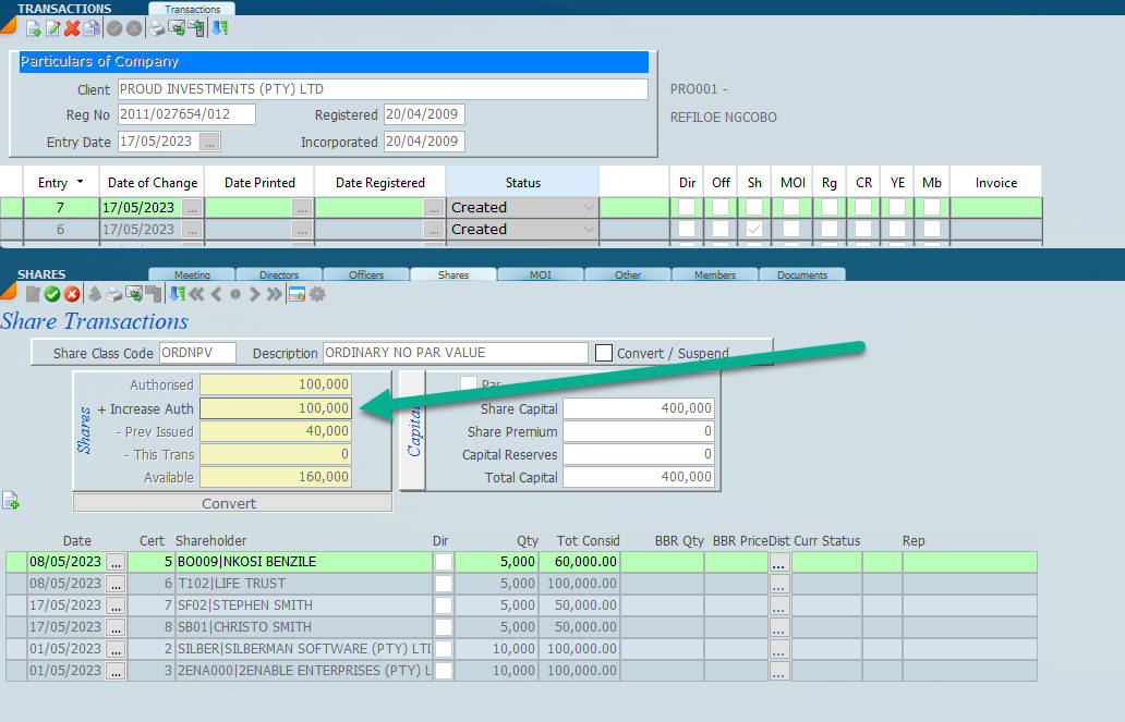 To increase the auhorised share capital, in edit mode add the number of the increase of shares. Only No Par Value authorised can be increased. Par value shares require a procedure in company law which you will find in Regulation 31.