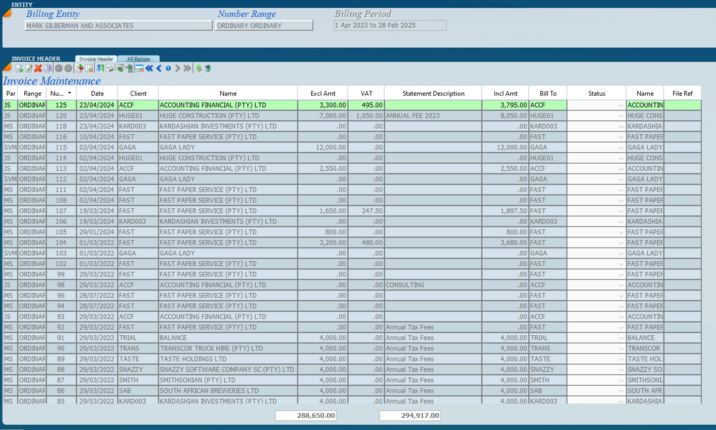 Click on the switch view icon and you will get the form for entering an invoice. You will notice at the top we have got the Billing Entities so by clicking on the down arrow we can select the billing entity and on the right hand side we have got the Number Range. The principal of this is that the invoice entry works in the same way as the project invoicing works. The only difference here is that you have a choice as to whether you want to do a direct invoice against the client (does not reduce work in progress) or you want to do it against the project. To get an idea of how the invoicing works please refer to the section on Project Invoice