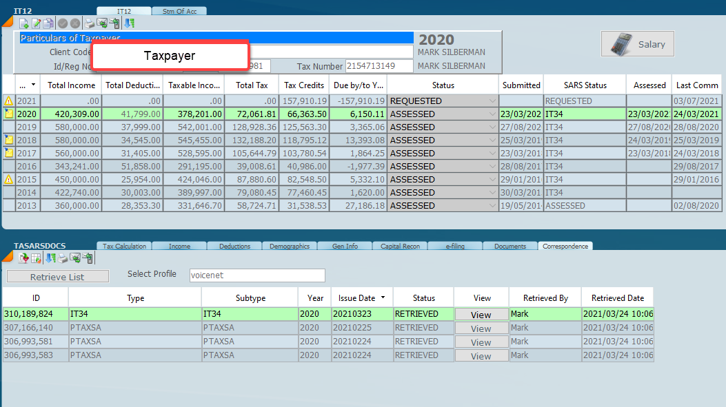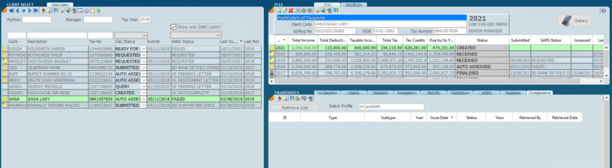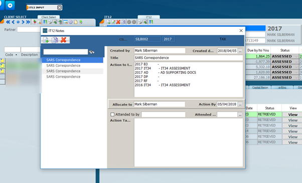 Click on the Correspondence Tab (last tab on the right) to see the correspondence that has come down from SARS. Correspondence will include assessments and letters and can be set as a manual or automatic function. Its recommended to make this automatic. To set the Automatic Assessment click here.