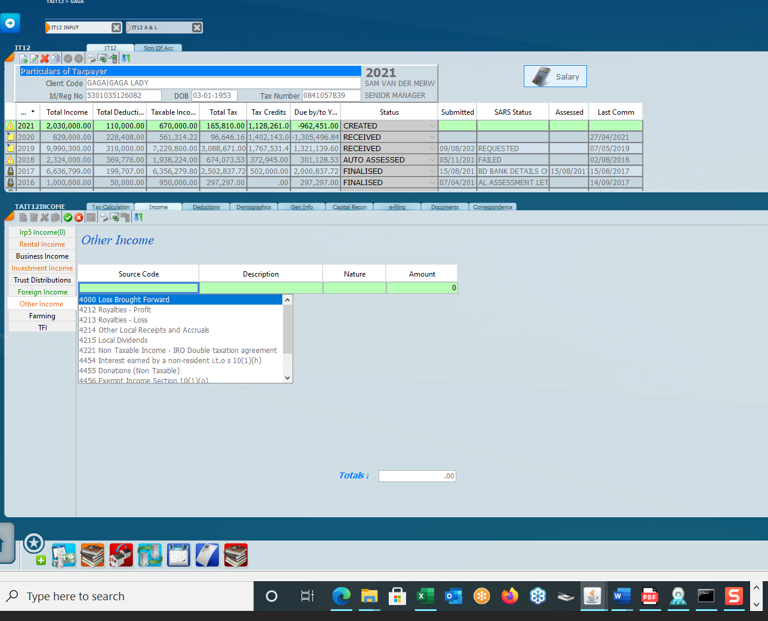 Note that the first code is 4000 which is the way we tell the system what the assessed loss is so that we may get an accurate tax calculation. The assessed loss must be entered as a minus figure.The assessed loss entered is not sent through to SARS as they already have the figure on their systems.