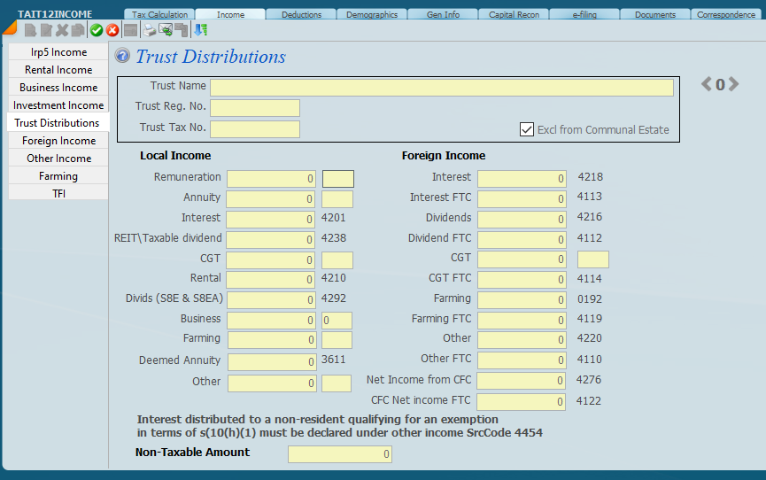 All trust distributions are to be entered on this screen which is in edit mode. Most of the items have source codes, however where there is a yellow space select the source code from the drop down of source codes when you click on the blank yellow area.