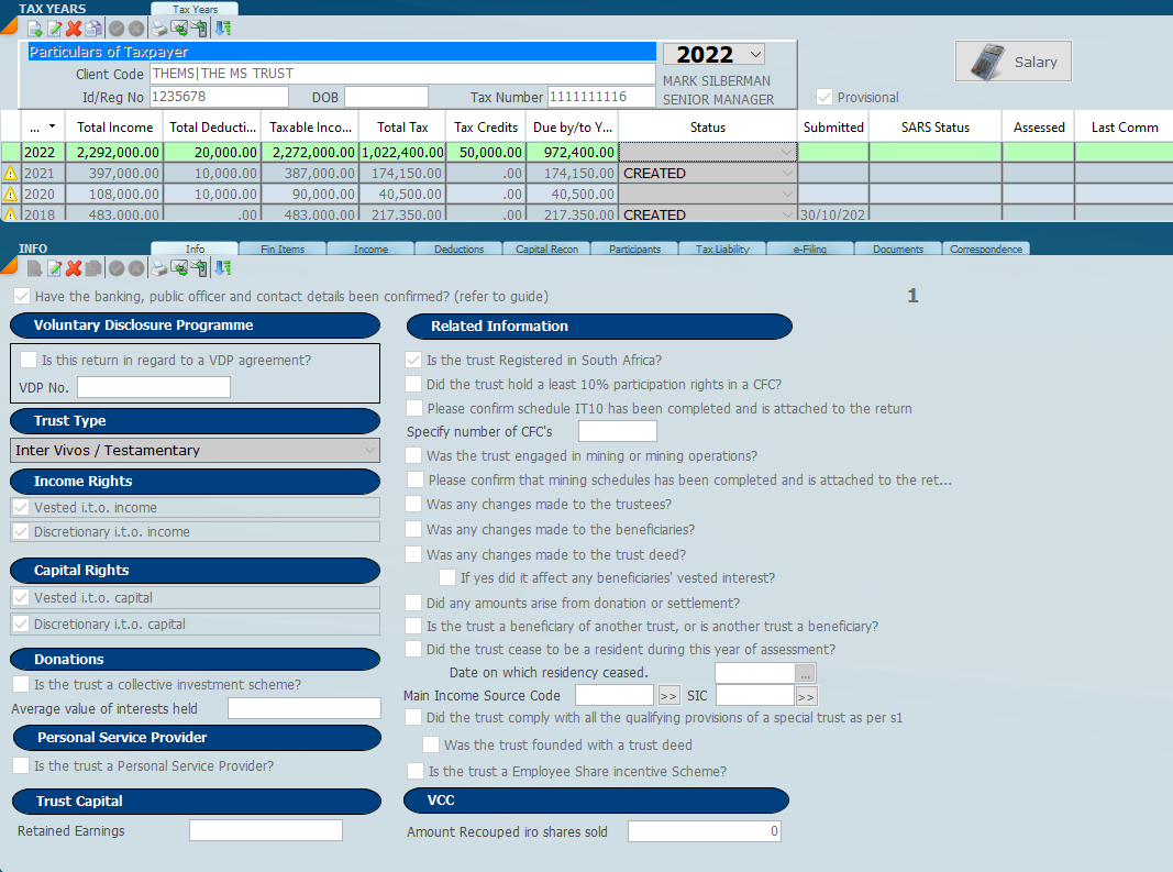 When working on a tax return ensure that you are on the correct year. Make the STATUS of completed years FINALISED.