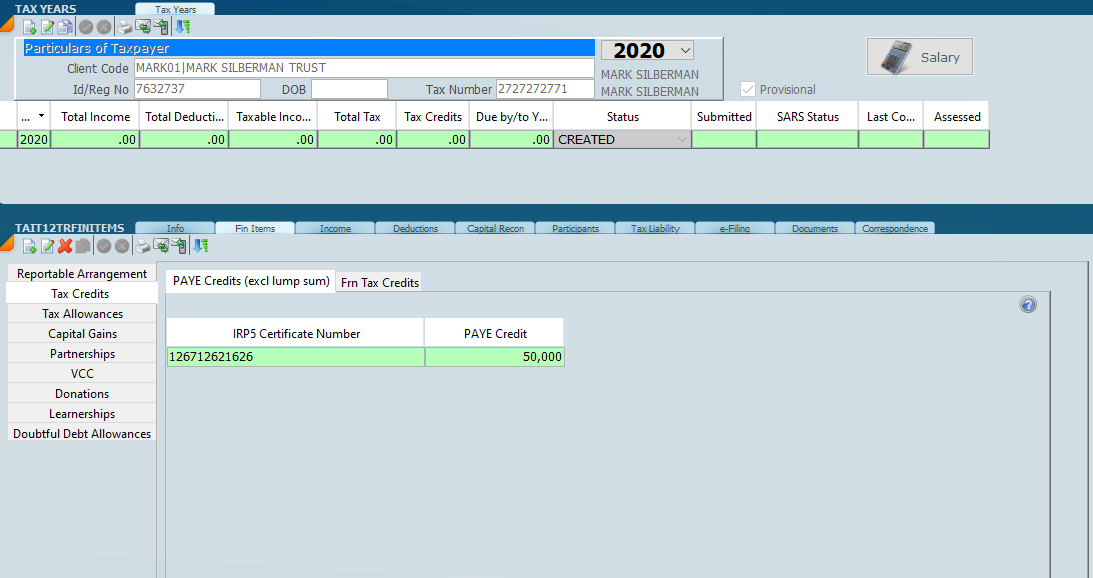Enter the IRP5 certificates on the screen below as there is no prepopulation of IRP5's for trusts at this stage.