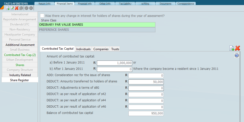 Detailed below is the screen that you are required to fill in for contributed tax capital. The list is only a requirement for medium large companies and it is necessary to do one for each type of share class that the company has. Contributed Tax Capital is a concept that the preparers of tax returns should be familiar with.