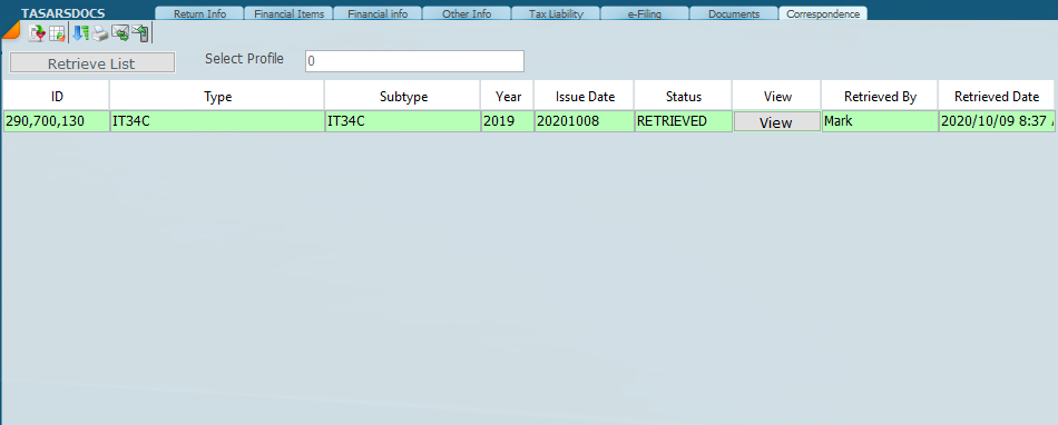 Click on the Correspondence Tab (last tab on the right) to see the correspondence that has come down from SARS. Correspondence will include assessments and letters and can be set as a manual or automatic function. Its recommended to make this automatic. To set the Automatic Assessment click here.
