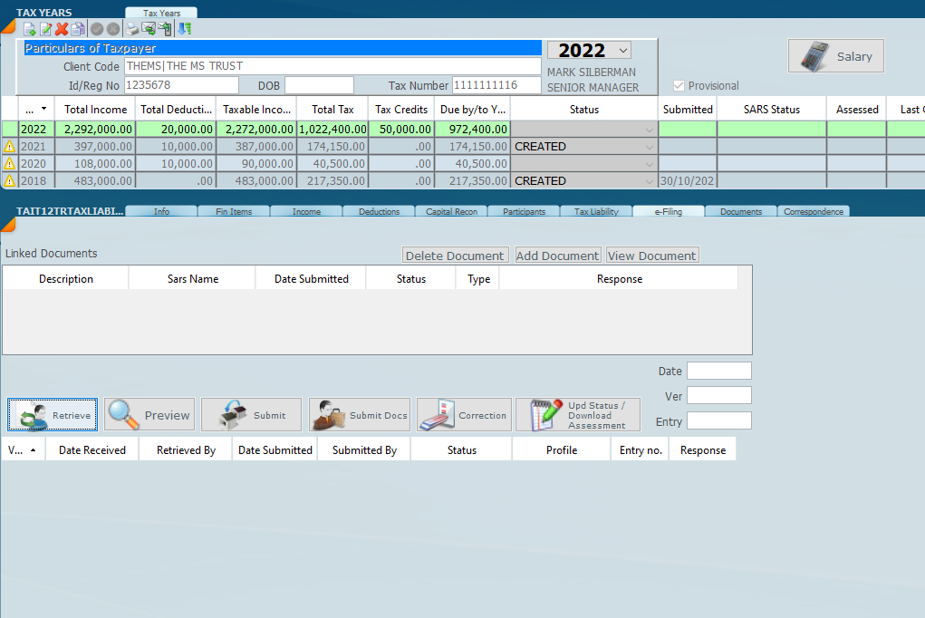 This screen allows filing of the trust tax return as well as filing documents to SARS.