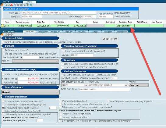 The screen below indicates the front page of the ITR14 tax return. There are some very important bits of information that you need to understand and address on the front page called Return Info, the most important being the company type which we call the container type.