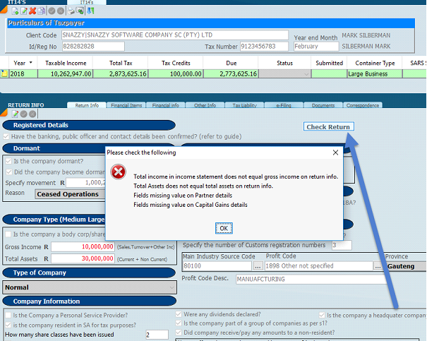 Please note the check return button which will give you a list of all the items that the system detects in error.