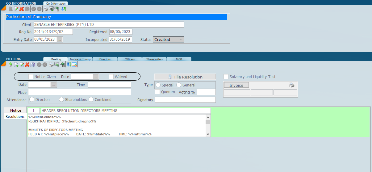 If there are resolutions choose the resolution paragraph required. For more information see the Meeting link. The meeting tab allows the user to indicate what kind of meeting it is, shareholder, director or combined and various other bits of information about notice period, whether it has been waived etc.