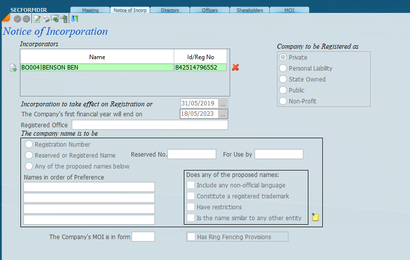 On formation if there is an Incorporator to be appointed click New and then click on name. Ensure that the incorporator is in the master file. Enter the code for the Registed Office.
