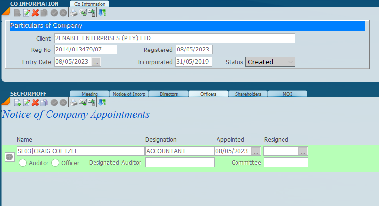 On formation if there is an officer to be appointed by clicking New