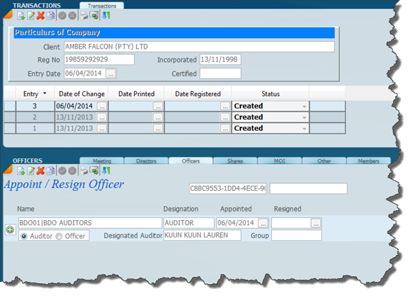 The Officer’s tab and this will work in a very similar basis to the way the appointment and resignation of director’s work. The appointment and resignation of an Officer will apply to any one defined as a Prescribed Officer as well as the auditor, members of the audit committee, members of a board committee, etc. Sky Sec will maintain these records and produce the necessary registers. When you appoint an officer it will be necessary to add a designation by clicking on the designation where it will give you a list of the designations you can select.