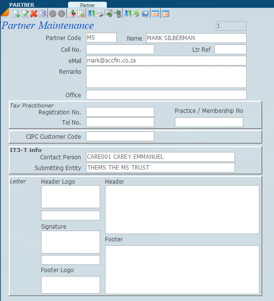 This is what the Partner screen (see below) looks like it's important to enter all the detail in regard to partners as these items will be used for letter writing and tax return filing. Displayed below are the other screens in this section.