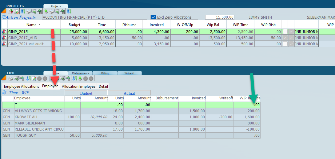 After the invoice has been processed the project enquiry screen will appear as below. Notice that the invoices that have been billed reduce the wip balances for each employee.