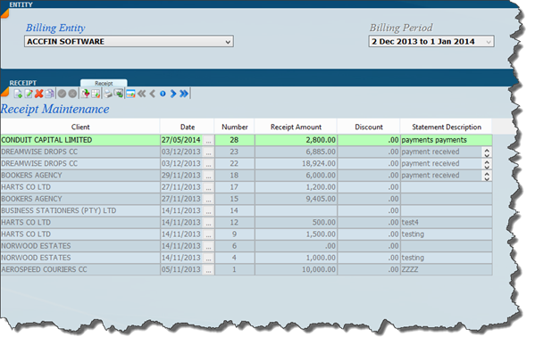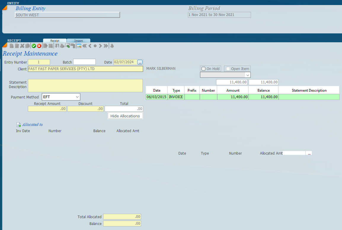 The screen below indicates a receipt in process. You enter the actual receipt just below the statement description and then in the window below you can allocate receipts to an invoice by clicking on the invoice number. This will give you the list of invoices that you can choose from. If you do not allocate the receipt then the system will automatically do what we call an auto allocation taking the receipt off the oldest balance or invoice.