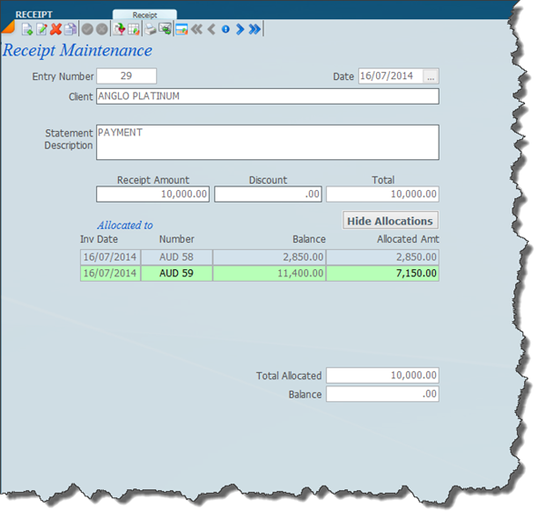 The screen below shows a receipt of R10,000 that has been allocated to AUD 57 AUD 58 and AUD 59.