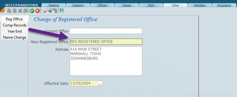 The screen below is where you set up the link to the registered office. Click on the field indicated and choose the registered office required.