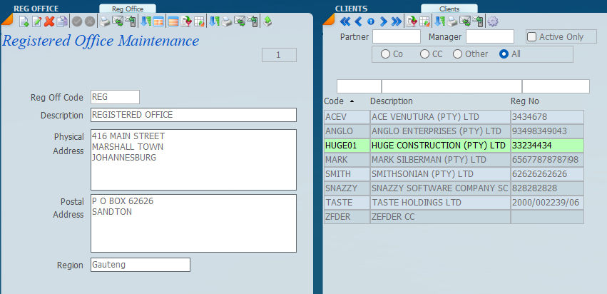 The clients attached to a particular registered office are indicated on the right.