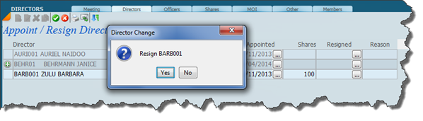 The resign director works in a similar way to appoint. Click the Edit button and then click the blank square next to the director (on the left) that you want to resign and the following will pop up.