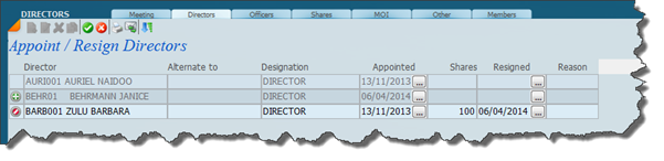 Click the green tick to save. Note the red mark to the left of the resigned director indicates that the director has resigned in this transaction.