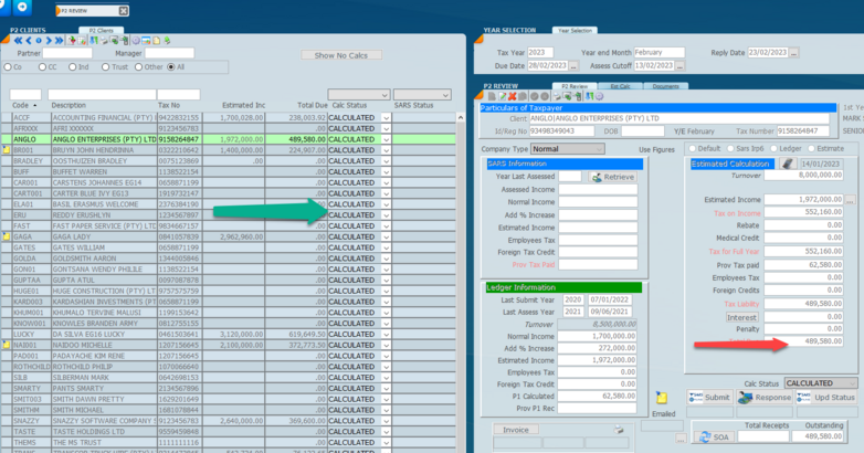 The Calc Status is shown (i.e. what you do) as calculated and the provisional tax has been calculated. The SARS Status will show the interaction with SARS.