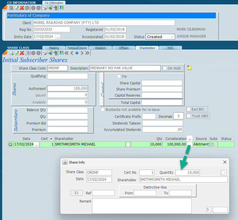 The principal of using this screen is that on the bottom part of the screen you do the allotments, making sure that the top part shows the correct information in regard to issue and the number of shares that are available. These should always reconcile.